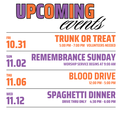 Need help dealing with grief? GriefShare began a 13 week series, Monday, September 8 at 6 PM. Questions call Mimi Dutton at 585-507-3487.